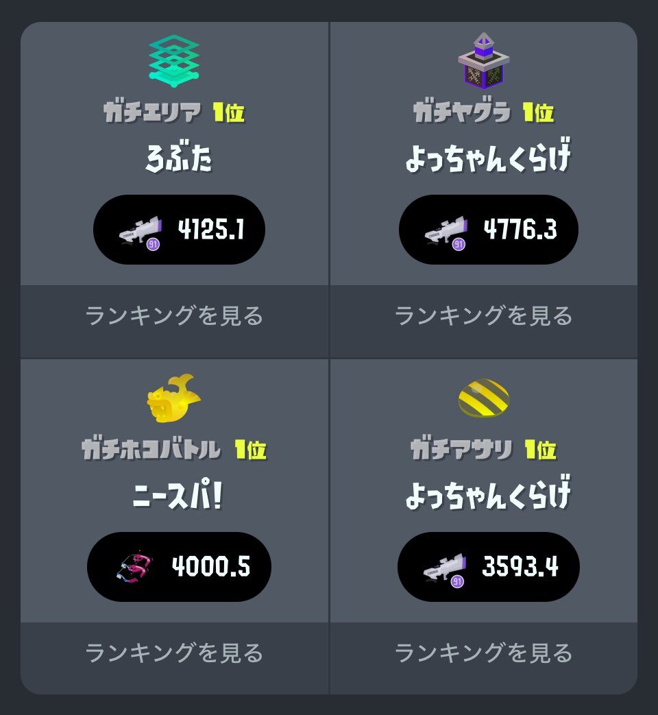 よっちゃんイカがヤグラ5000行ったらアサリはちょこぺろがほぼ5000みたいなもんだしあとホコだけか