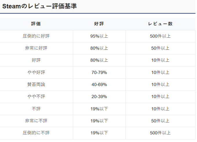 以前聞いたけど、Steamの評価ってよっぽど(ゲームとして遊べないほど)のことがない限りは不評にならないらしいね。