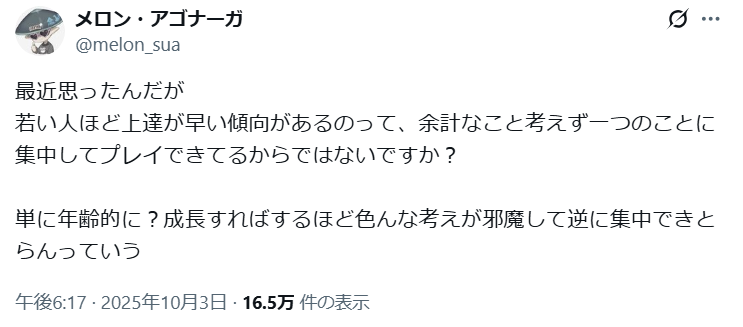 若い人ほど上達が早い傾向があるのって、余計なこと考えず一つのことに集中してプレイできてるからではないですか?