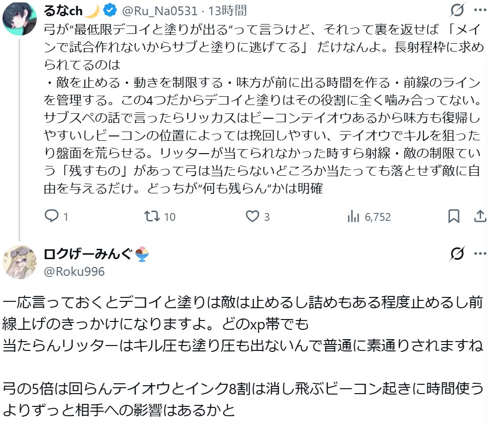 他の長射程のリッターと比べた時にリッターは最低限射線を通すだけで、相手の動きを制限しつつ、味方が動けるスペースを作れて前を取れる“最低保証”がある。弓はこの最低保証すら無くて、味方次第で武器性能が半分以下まで落ちる。弓は当たれば強いのは分かるけど、当たれば強いってどの武器にも言える…