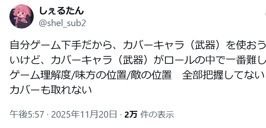 XP3600しぇるたん氏「カバーキャラ(武器)がロールの中で一番難しい」