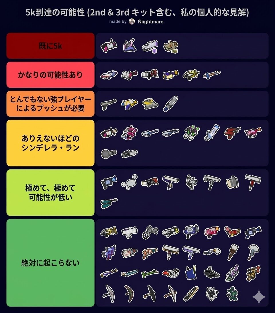 XP5000による「今後XP50000を達成できそうなブキTier表」