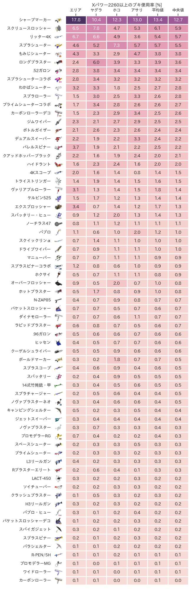 一部のブキ(特にシャプマ)が狂ってるけど、67種もあるにしては割とバラけてて意外